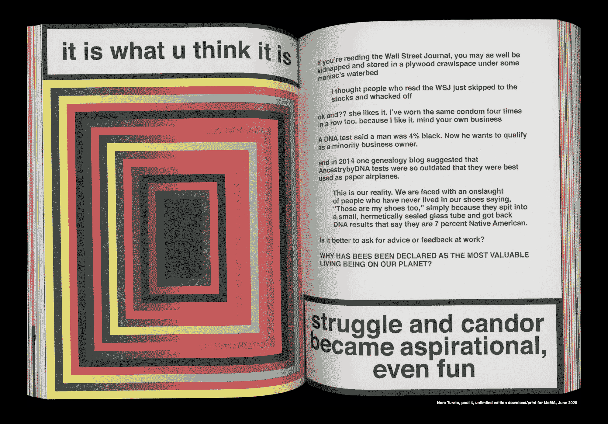This is not to say, however, that there are no artistic (design?) interventions in Turato’s pools – Turato has said that “Graphic design gave me the freedom to be an artist.” In pool4 statements are typeset in spreads reminicent of Marshall McLuhan’s The Medium is the Massage, Jenny Holzer’s Truisms or Barbara Kruger’s ‘statements’, interlaced with a particular kind of ‘postinternet’ irony. Some are earmarked as ‘warnings’, set in the style of a cigarette-box notice; others are laid over brightly-coloured concentric windows, like the ‘abstract browsing’ of Rafaël Rozendaal or an op art maze. In later examples, where text has moved to the walls of a gallery space or motion-graphics, these arrangements speak to the conceptual pop-art of Ed Ruscha or (in a perhaps ungenerous comparison) Douglas Coupland.5