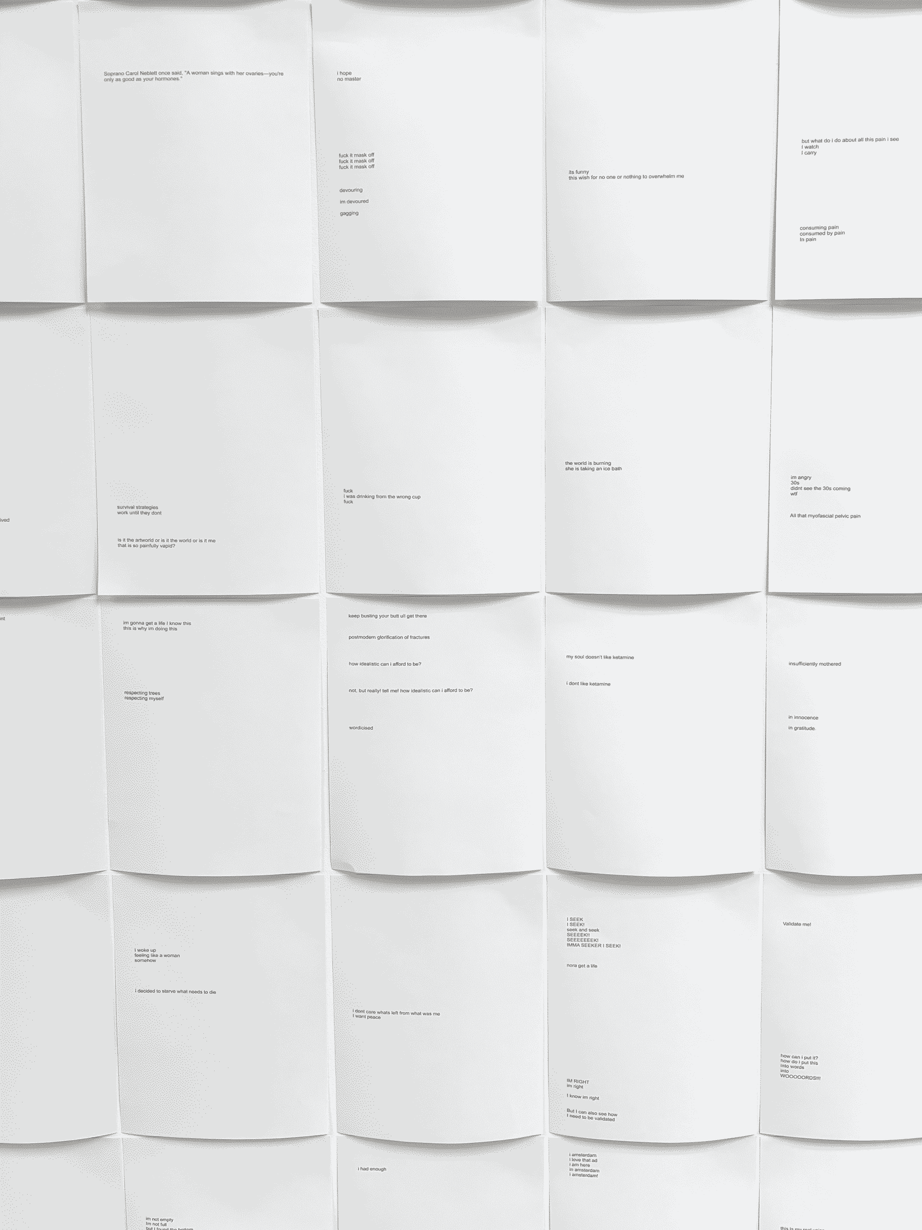 ...a flood of compulsive language confronting the lived tensions of late capitalist subjecthood: being a woman, an artist, a consumer, and a body. Anger, hope, hunger, humor, and despair pulse through voice memo–like rants on cultural inertia — “it’s the freeze in everything / in our bodies / in our cells / in our culture / in the air” — and poetic mantras: “HIDE / SEEK / SOOTHE.” A critical and self-reflexive thread runs throughout, on making art and surviving under capitalism: “fuck endurance art / I’ve endured enough,” she writes. “I need to make a living / and that means selling my work?” Technology, calendars, agendas — tools of bureaucratic optimization — appear as jarring mechanisms of control, disciplining unruly subjectivity into quantifiable systems: “ALL FUCKED BY THE EXCEL SHEET!”; “excel sheets rule the planet / did u know that?” 1