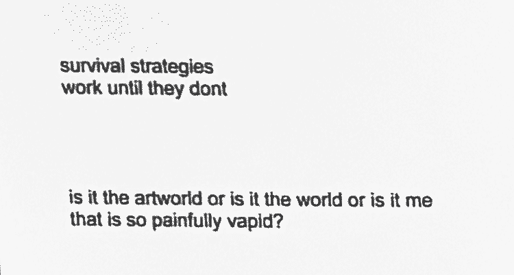 The show featured scraps of text, writing, notes, printed on A4 sheets of paper arranged in a grid on the ICA walls. In a way, it seems pointless to recite these fragments here, in series, because the ‘impact’ of the artwork was to be felt in their overlapping, un-edited, non-linear arrangement. And yet, not to focus on the content of these messages would be to admit – perhaps, as pool7 implies – that contemporary culture has fully succeeded in hollowing out that term itself.